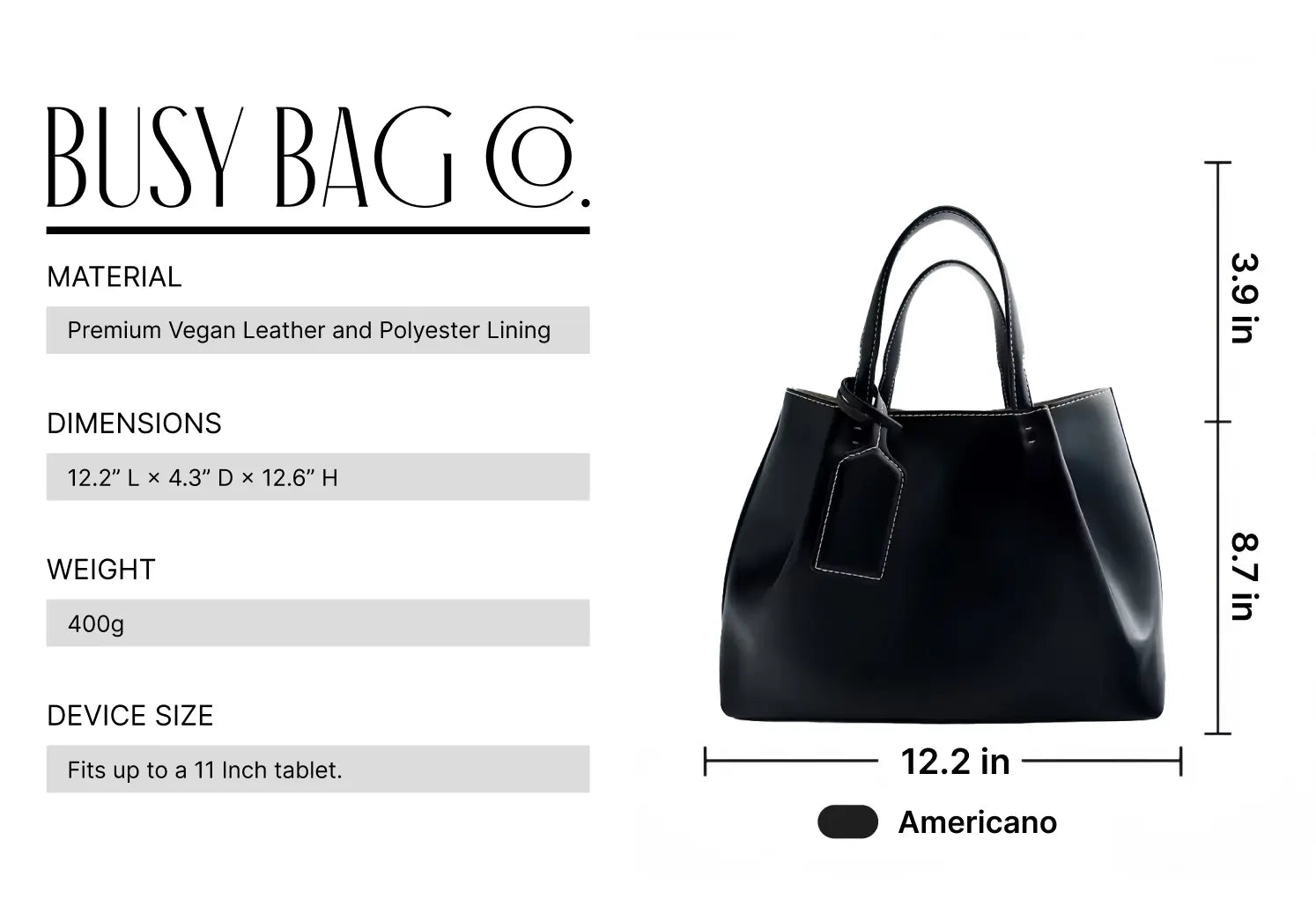 Crafted from premium vegan leather with a soft-touch lining, the City Tote Mini combines refined design with everyday durability. Its structured shape, removable interior pouch, and reinforced stitching keep your essentials organised while keeping you moving effortlessly. 22cm H Ă— 31cm L Ă— 11cm D