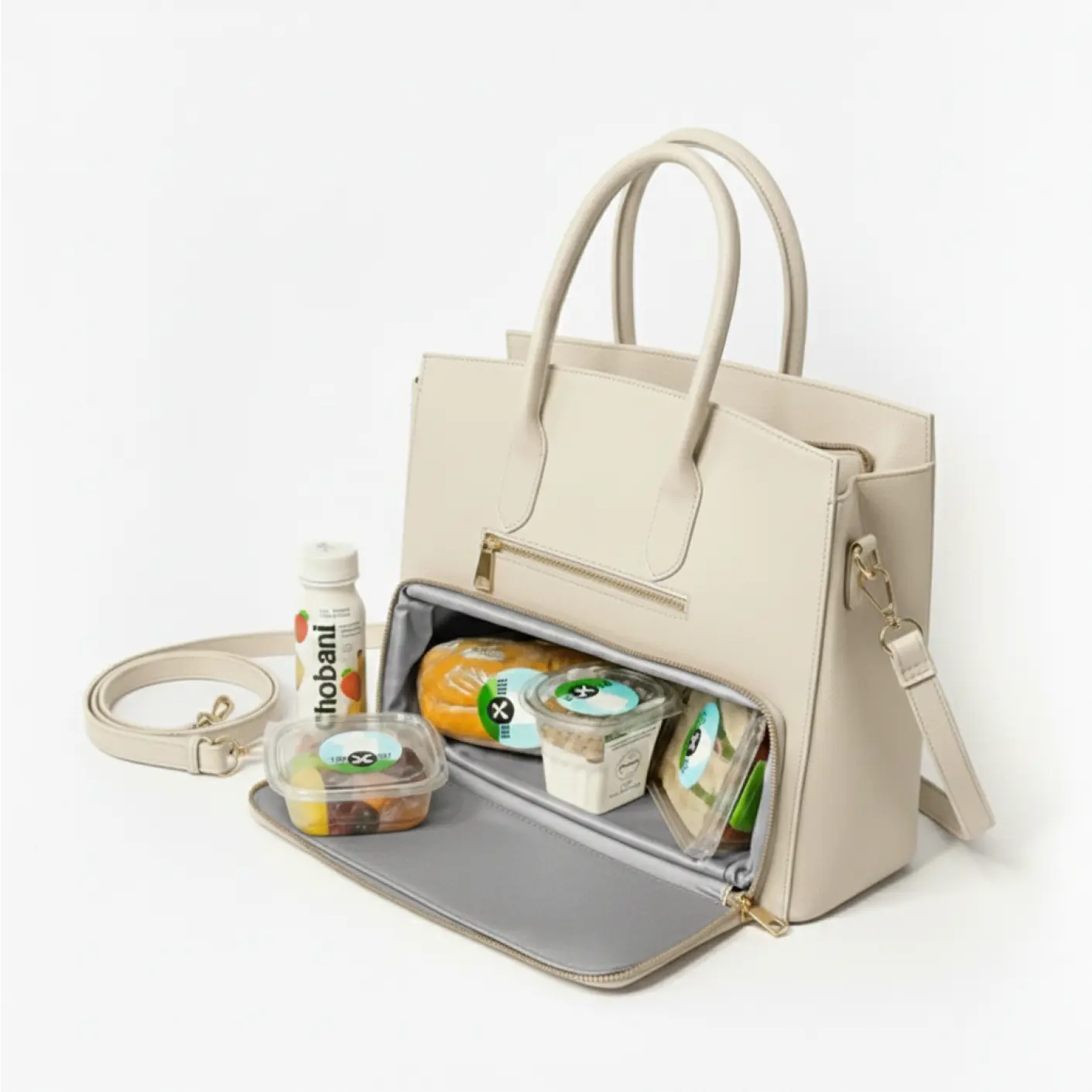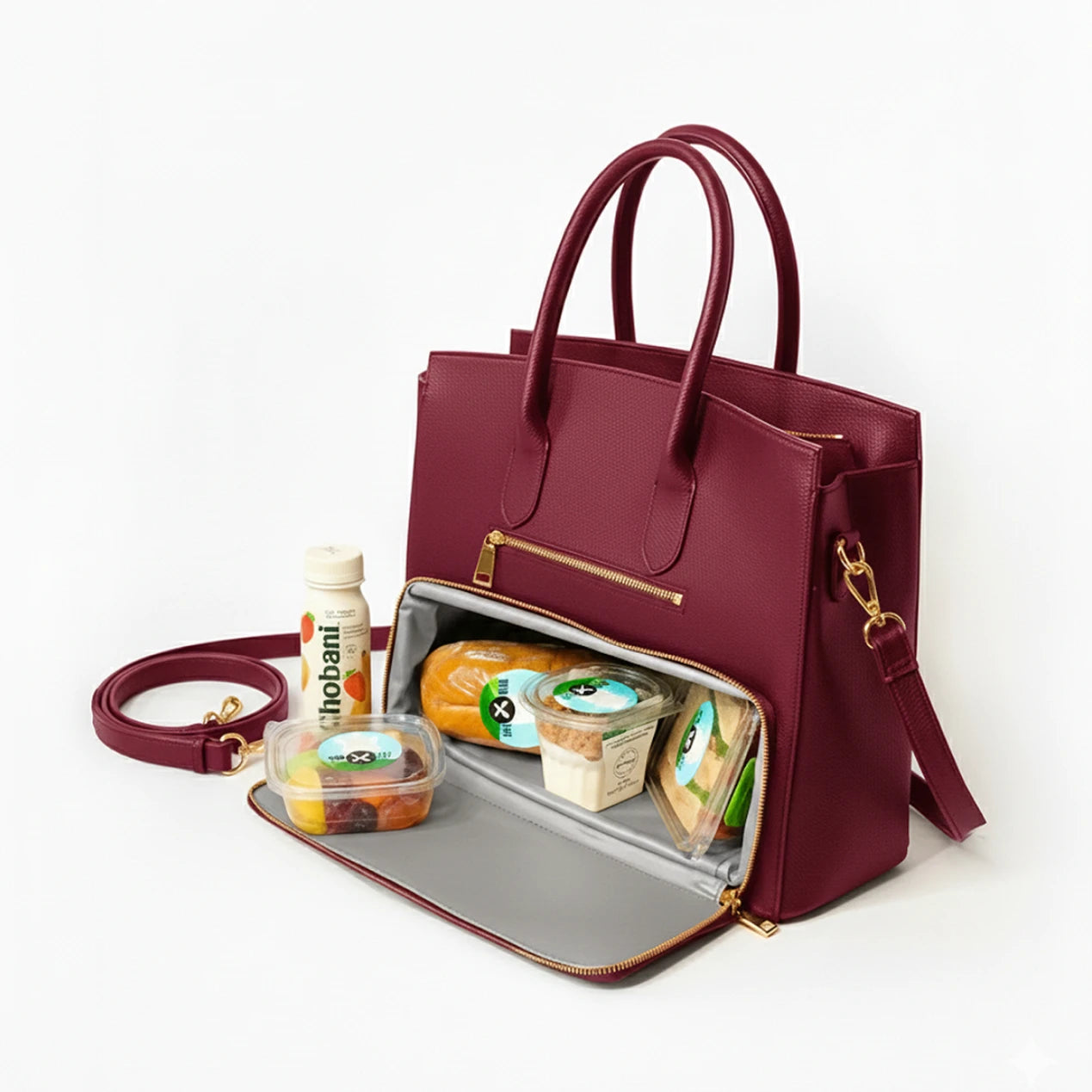 Meet The Elara Tote, crafted from premium vegan leather and designed to bring a refined look to everyday meals. It keeps your food fresh, your drinks chilled and your essentials neatly organised without looking like a lunch bag. With space for your lunch box, snacks, a tablet or laptop up to 13 inches and daily items, it is perfect for office days, commuting, school runs and everything in between.